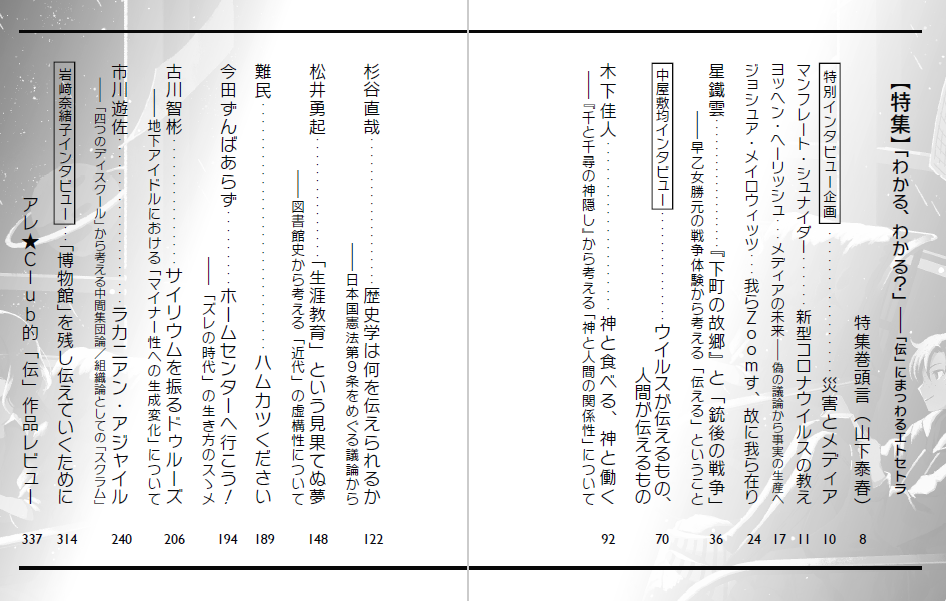 こちらは『アレ』Vol.9の目次ですが、前号と同じく、今号も全ての記事が特集となっており、特別インタビュー企画が1本、インタビューが2本、論考が6本、エッセイが2本となっています。また、ページ数は『アレ』史上最長の360pとなりました(前号で300pを超えて「まさかこれ以上増えることはないだろう」と思っていましたが、あっさりと更新しました)。